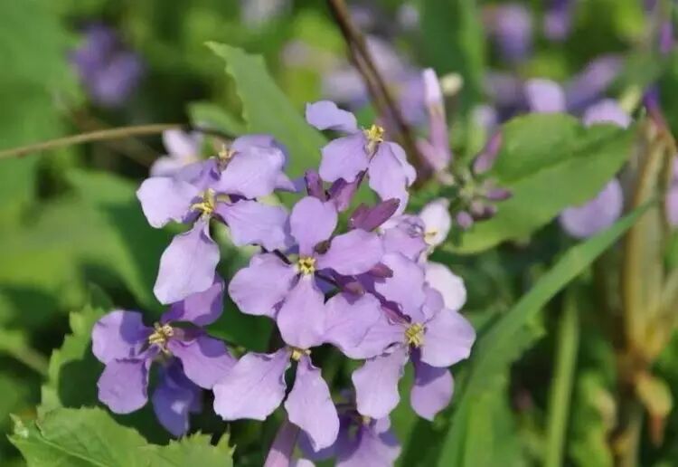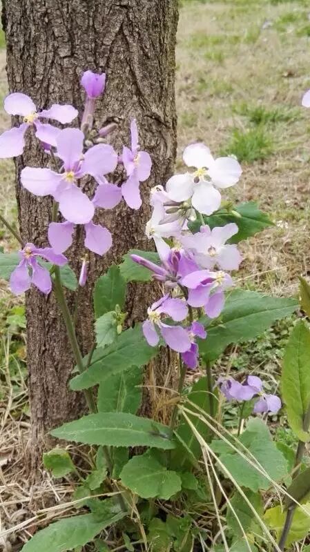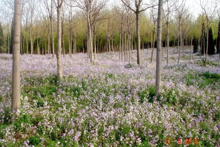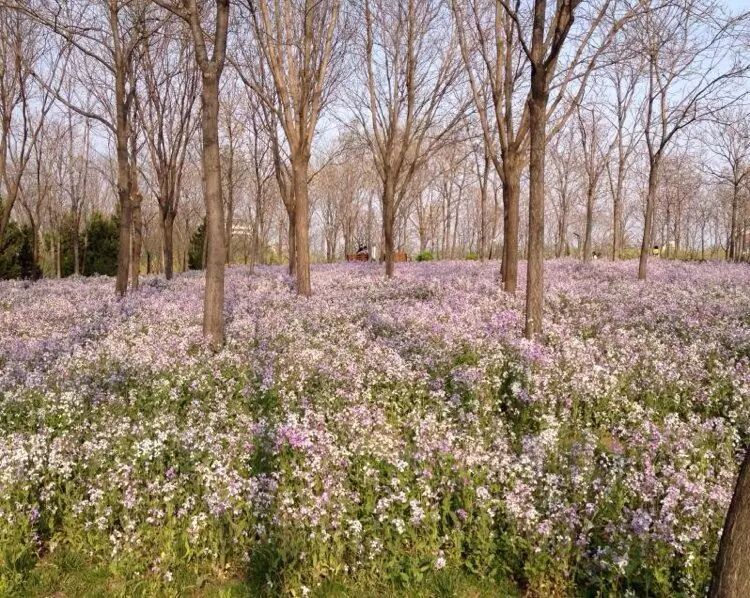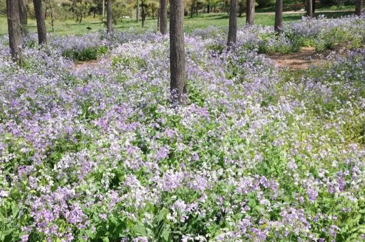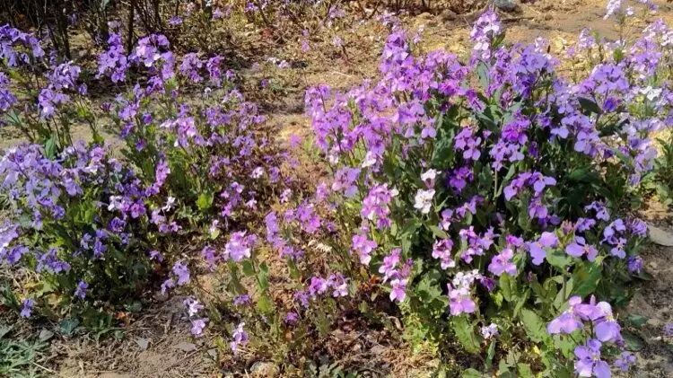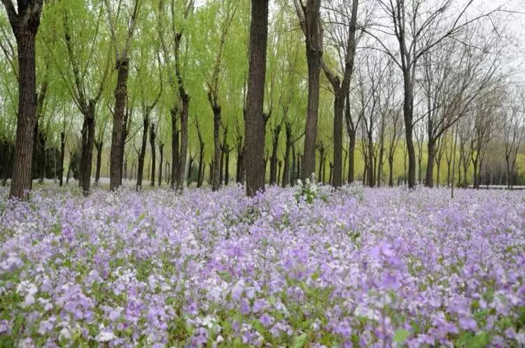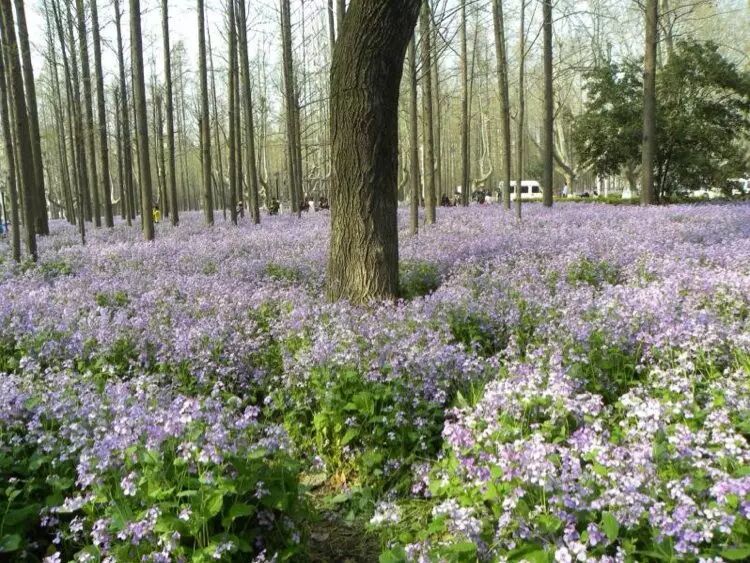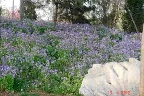 3. 满世界的紫色花海美化着一个个春天,让人不由自主轻轻伸出手,想轻触那花瓣,嗅那甜甜的幽幽的清香。 紫色花丛过,尽享一份绚烂的美,不由得好奇地去溯根求源,探寻这花儿的秘密。 4. 原来,二月兰又称诸葛菜。 这“诸葛菜”有来历。 传说诸葛亮率军出征时粮草接济困难时曾采其嫩梢为菜,并广植此菜,故得名。另因农历二月开兰紫色花,得名二月兰。 在鲁北,先于桃杏梨开花的是梅花。可梅花含苞到绽放的过程,已是仲春,路过二月兰花地,曾一次次打量,都不见二月兰有花事动静。直到农历的二月底,非得要到这鲁北的农历的二月底,它们才在很短的时间里,仿佛一夜之间紫成一片片。 二月兰,名副其实也。 附近新滨公园二月兰: 二月兰虽称“兰”却不属于兰花之类的兰花科,而是属于十字花科,在花卉中我们见到的紫罗兰就跟它同科。它的花瓣和花朵也确与紫罗兰样貌有近似处。令人意想不到的是蔬菜中的小白菜、甘蓝、菜花等,也跟二月兰同科。这些蔬菜开的花儿,细看也有十字花科花朵的特点。难怪二月兰又名诸葛菜,原来是名副其实的一种可食蔬菜呢。 我们现在,满世界的二月兰花是用来装扮春天,成为一种绿化花卉的,没人舍得去吃它,也多数人不知道它能吃的罢。 二月兰,它虽实质上不属于兰科,可它苗条的花枝,绰约的身姿,娟秀的花瓣儿,同样娇俏雅致。我们总不能因为它的易生易长易蕤葳无边,而一昧掬捧那物依稀为贵,轻视它的美。 尤其可贵的是,二月兰好养活。 它可生长于平原、山地、路旁、地边。 在我这华东的鲁北地区,就可到处生长二月兰。 小区楼侧: 二月兰的好养活还在于它对土壤光照等条件要求较低,耐寒旱,生命力顽强。这样适合它生长的地域就广大去了。也所以,我这黄河以北的北方小城这几年也因此让二月兰到处蔚然起来。 二月兰适应性强,从东北、华北,直至华东、华中都能生长。冬季如遇重霜及下雪,有些叶片虽然也会受冻,但早春照样能萌发新叶、开花和结实。这点,我是多年跟踪亲历亲睹了。 由于喜欢这花儿,由于第一次见到它是我和母亲一起看到的,母亲去世后,我广查资料,咨询本市园林处这种花儿的种植技巧,了解其途径,就买了二月兰种子在其七八月的播种期撒在了父母的墓地。结果,来年春天,父母的墓地开出了紫色的二月兰。我也曾将拍到的常带母亲去游玩的新立河西路树林里的二月兰带去祭奠母亲。 二月兰,就是这样容易栽植,养成。 初次开花的二月兰: 起初,二月兰主要是生长在长江以南,南京理工大的二月兰就全国闻名。就因为其耐寒性强,四季常绿,又比较耐阴,可用作地被,覆盖效果良好,叶绿葱葱,适合落户小城,这几年名副其实地唱了本地盛春的主角。 5. 本市也有各种名花,比如附近公园三月里完成整个花事的梅花,夏日里高贵辉煌灿烂的郁金香花海,更有万亩玫瑰园,还有个规模很大的桃、梨、杏、山楂、石榴各有大片地盘的“市内桃源”。 但,诸如郁金香,需要花不菲的价钱空运来,之前听说是漂洋过海来落户的。其他的花儿则要仰赖高高的树枝或者冬日不死的花枝。 唯有盛春里的二月兰,是春日里独立婷婷着茎杆儿,不仰赖任何扶持,不攀附任何高枝的径自独立盛开的花儿。 它柔弱,纤细,娟秀,小家碧玉一般,却比谁都有挺立的骨气和独立的傲骨,甚至胜过高洁的梅。不是吗,梅也须得有籍以寄身的枝条啊,它亦非可自生自灭四季常绿。唯独二月兰,花开过,妆点过盛春,再绿一整夏,一整秋,延续子嗣的事儿它自己解决,那撒下的种子就在秋天开始酝酿着生机。寒冷的冬天到来了,小小的萌芽的二月兰在腐草中,树根旁,落叶下径自绿着,你扒开腐叶,它们好好地绿在那里。 冬日里亲眼见到的年幼的再生的二月兰: 6. 二月兰,它是那种自尊自爱自立,不管有否眷顾都会径自盛开径自吐香的 大写的花儿。 沾个“兰”名的各种花儿,天生高贵,身子金贵,需要富养,比如各种兰花,君子兰,还得为其觅得雅室相配。就是其他花儿,除了小野花蒲公英花和苦菜花,也要么仰赖高枝,要么像迎春一样呈丛条支撑,要么择着相适之地,对环境和生长条件各有要求。春花中唯有二月兰率真坦荡天然,不择地不靠依附,几夜春风便给点温度就灿烂,不用声张,盛放得泼泼扬扬,紫得满眼满世界都是,毫无其他娇贵花朵们的故作矜持压抑个性。 春到好处,满世界的紫,将淡淡的甜香传遍春天的每个角落。 万紫千红里,纯色的紫色花海是天边也借不来的春日云霞。 7. 紫色,自带一种梦幻般的浪漫气质和高雅色调。 优雅,高贵,神秘,隽永,如梦似幻,如歌如诗,紫调子本身,自带一种风流。 人们赋予紫色许多美好的内涵。比如“紫色梦幻”。 有说喜欢紫色的人通常具备艺术家的特质,容易多愁善感。 连人世间那美好的爱情,也会赋予为“紫色爱情是高贵纯洁的爱情”。 除此之外,紫色在中国传统中还代表圣人,帝王之气,如北京故宫又称为“紫禁城”,也有所谓“紫气东来”的吉祥说法。西方则将紫当作尊贵、神圣。 而二月兰,就得天独厚地拥有了这风情万种的紫。 这让本属可食蔬菜和活得泼辣的二月兰生得平凡,活得超值。 我看,这二月兰,是要颠覆了“物以稀为贵”了! 8. 于是我们就走在盛春里,看你将春天紫翻了天! 春潮,因你而变色,二月兰。 二月兰花丛(此图来自网络) 2012年春二月兰: 2013年春二月兰: 2014年春二月兰: 2015年春二月兰花丛: 